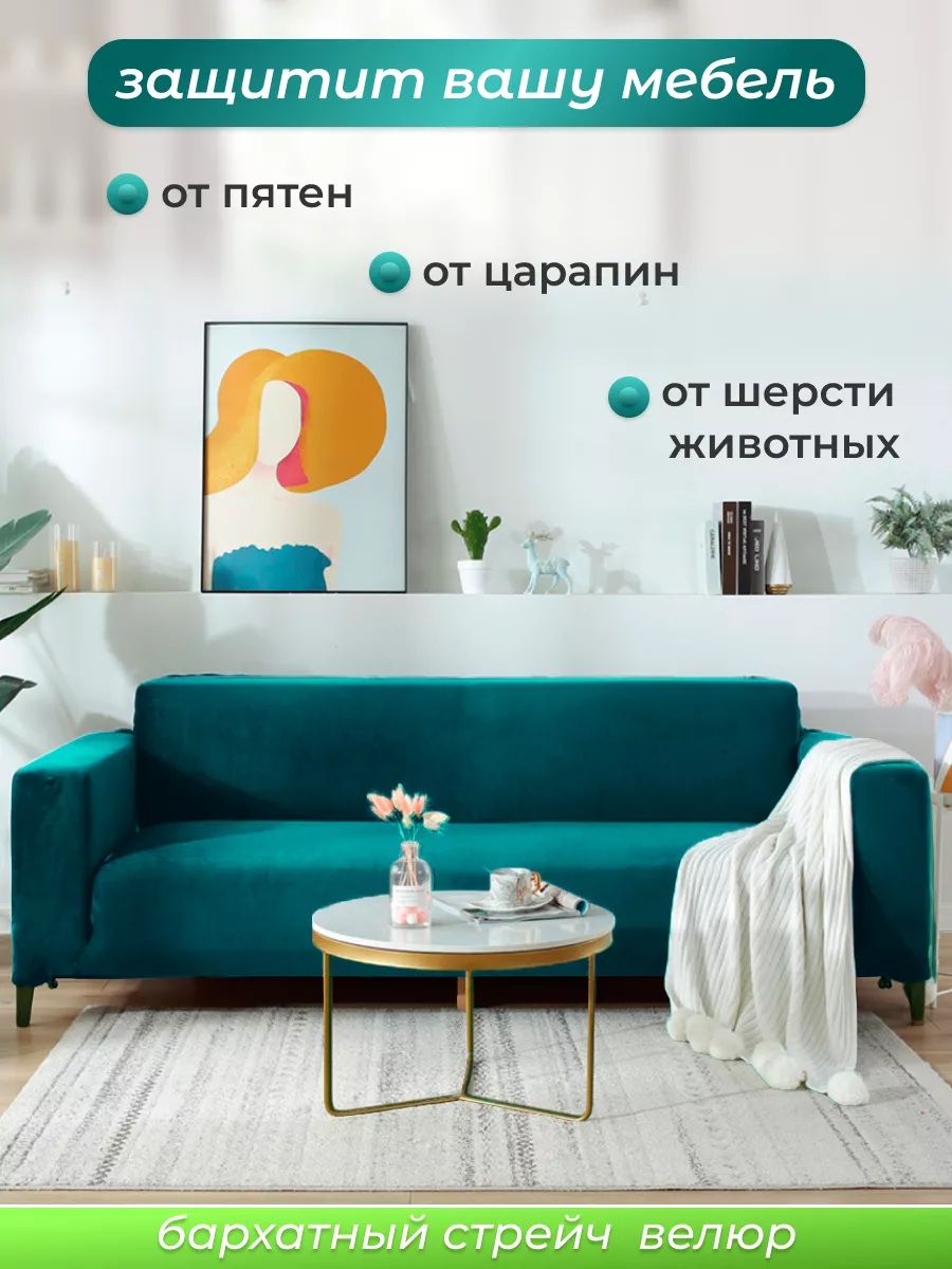 Чехол на 2-х местный диван без оборки Бархат, изумрудный