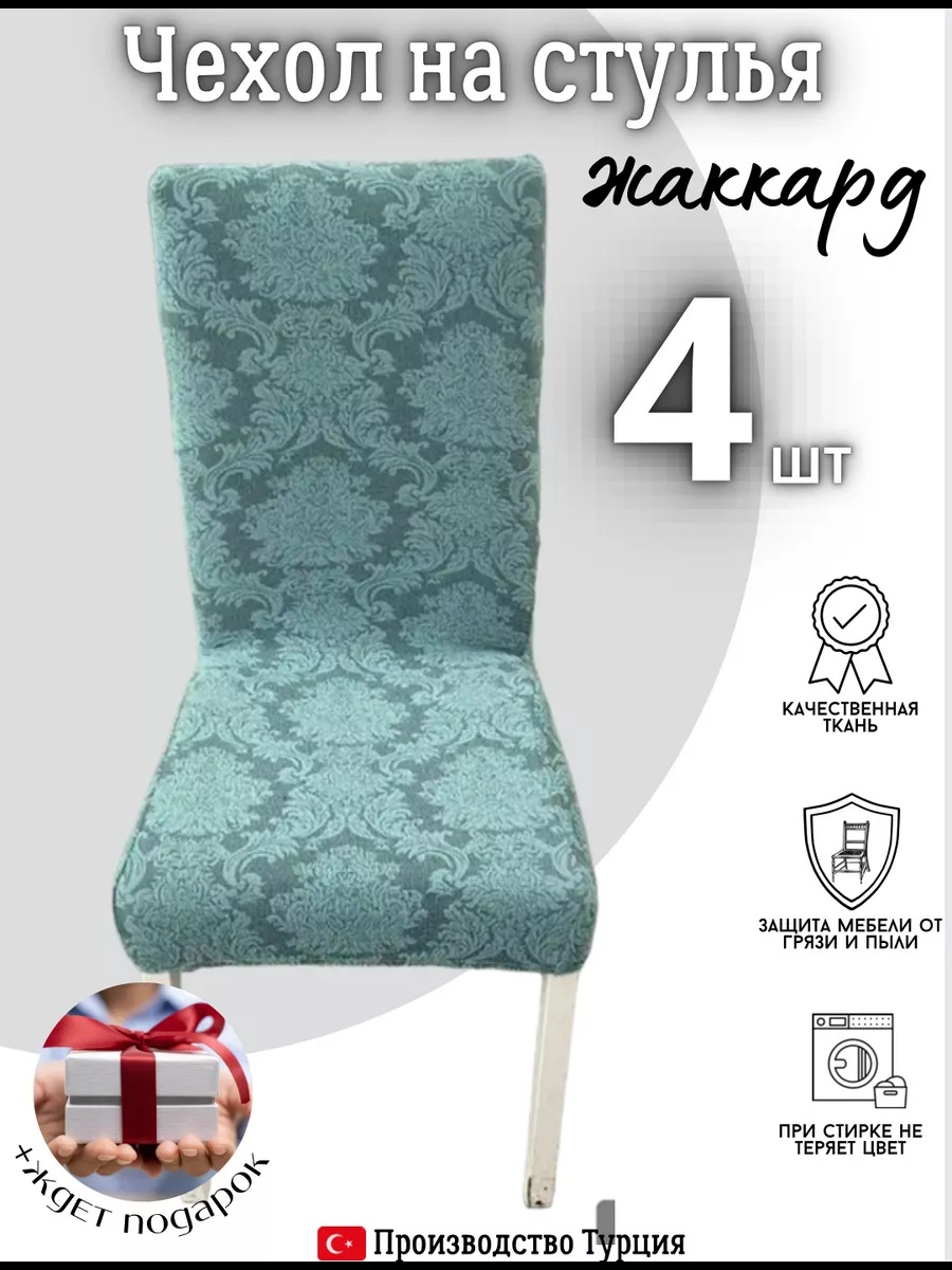 Чехлы для стульев (4 шт), без оборки, жаккард, изумрудно-зеленый