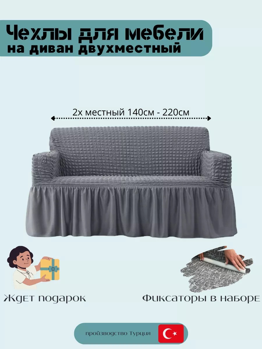 Чехол на 2-местный диван, с оборкой, стрейч, темно-серый