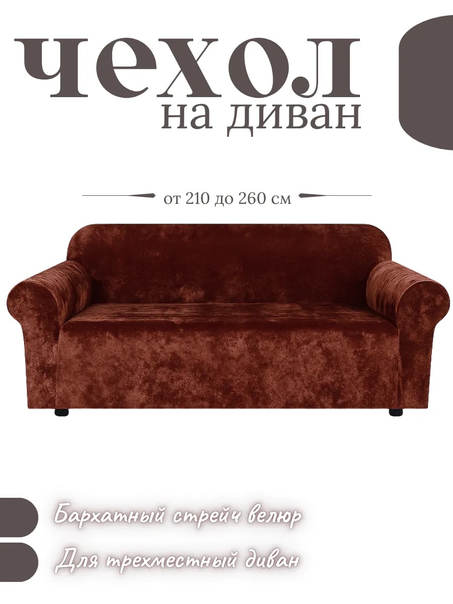 Чехол на 3-местный диван, без оборки, велюр, шоколадно-коричневый