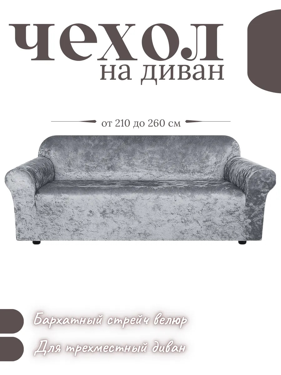 Чехол на 3-местный диван, без оборки, велюр, средне-серый