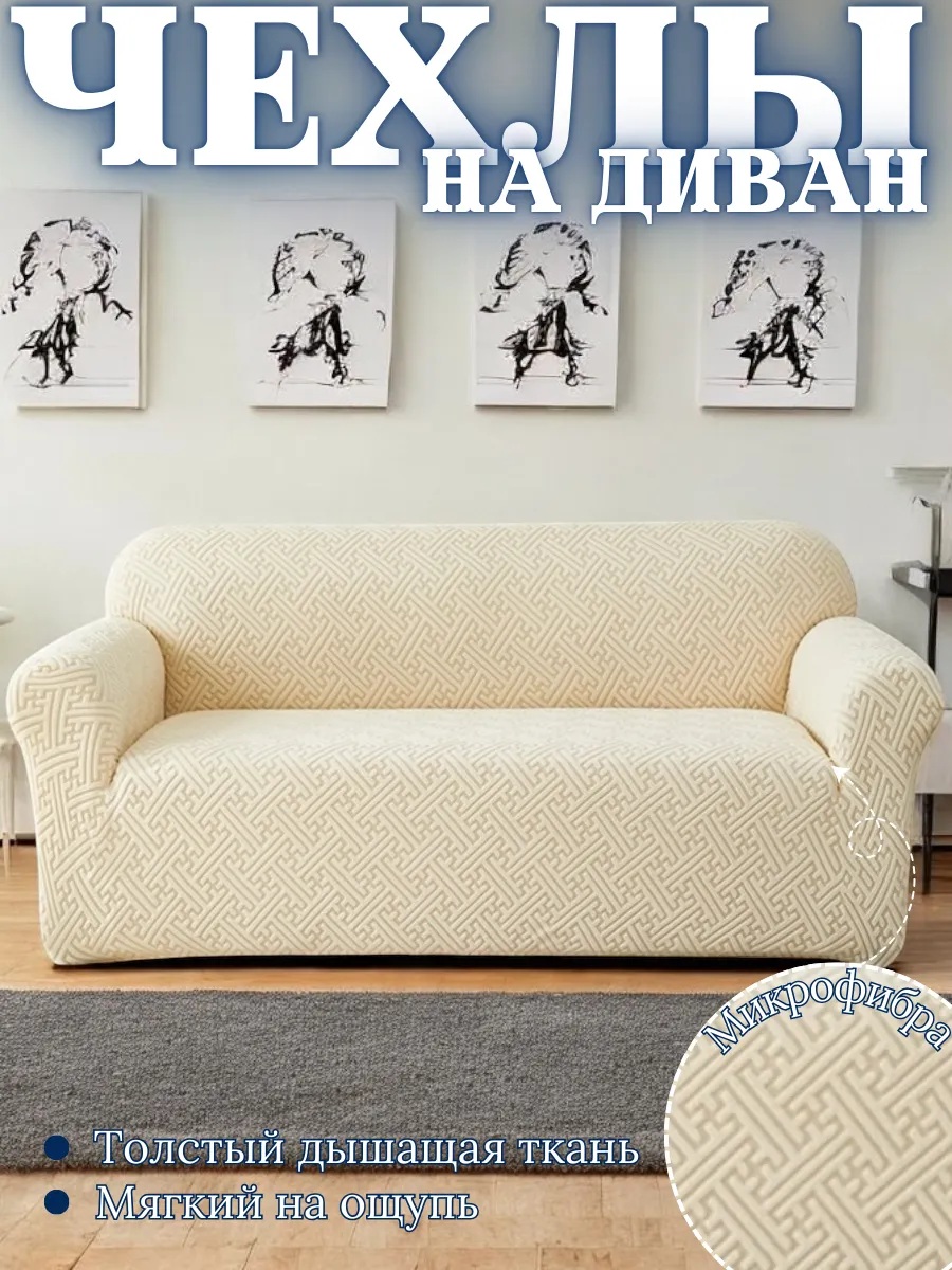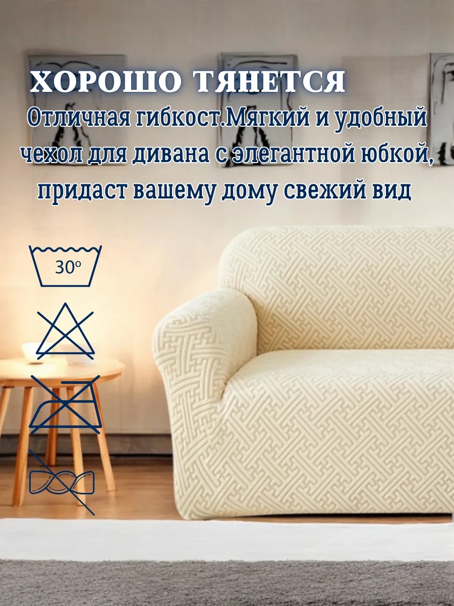 Чехол на 3-местный диван, без оборки, жаккард, кремовый, крем-брюле, кремово-белый