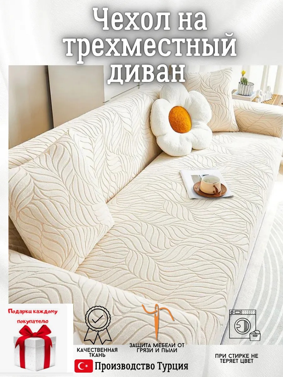 Чехол на 3-местный диван, без оборки, жаккард, кремовый, кремово-белый