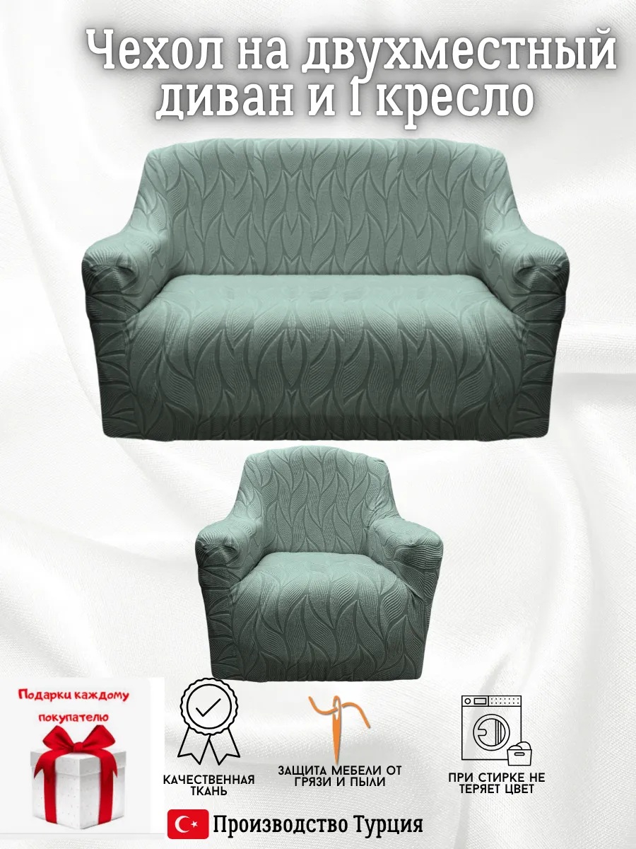 Чехол на диван 2-местный и кресло без оборки, жаккард, мятный
