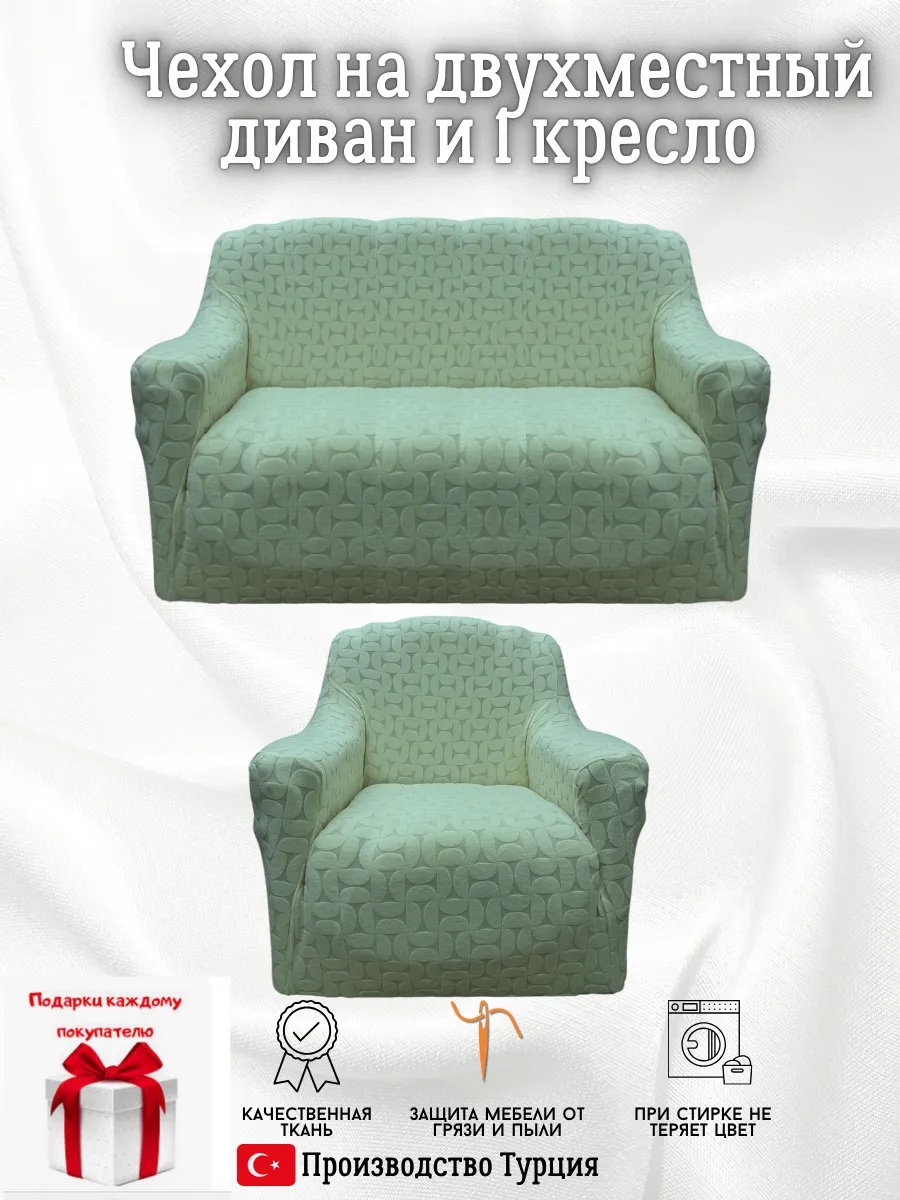 Чехол на диван 2-местный и кресло без оборки, жаккард, мятный