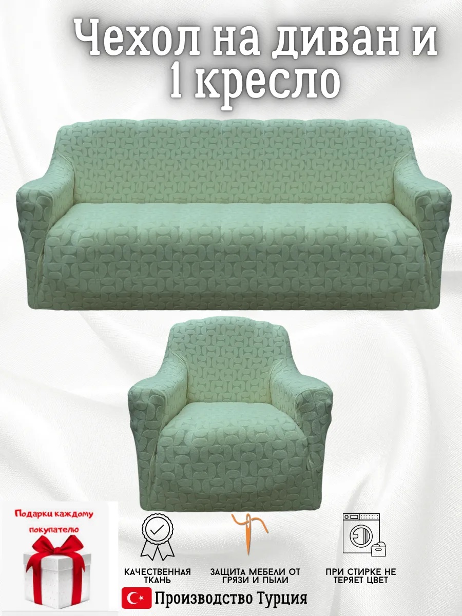 Чехол на диван 2-местный и кресло без оборки, жаккард, мятный