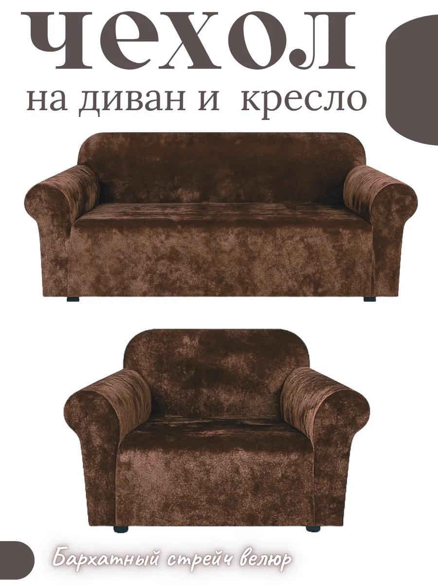 Чехол на диван 3-местный и кресло без оборки, велюр, шоколадно-коричневый