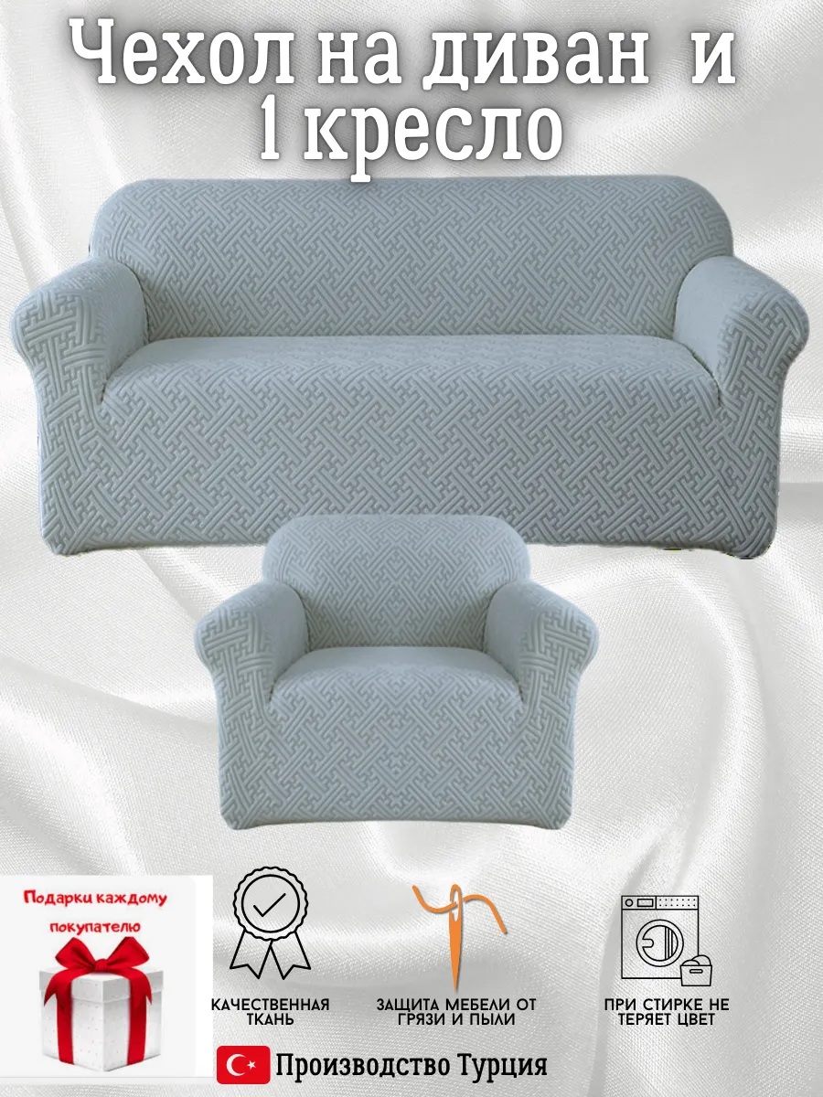 Чехол на диван 3-местный и кресло без оборки, жаккард, сине-серый