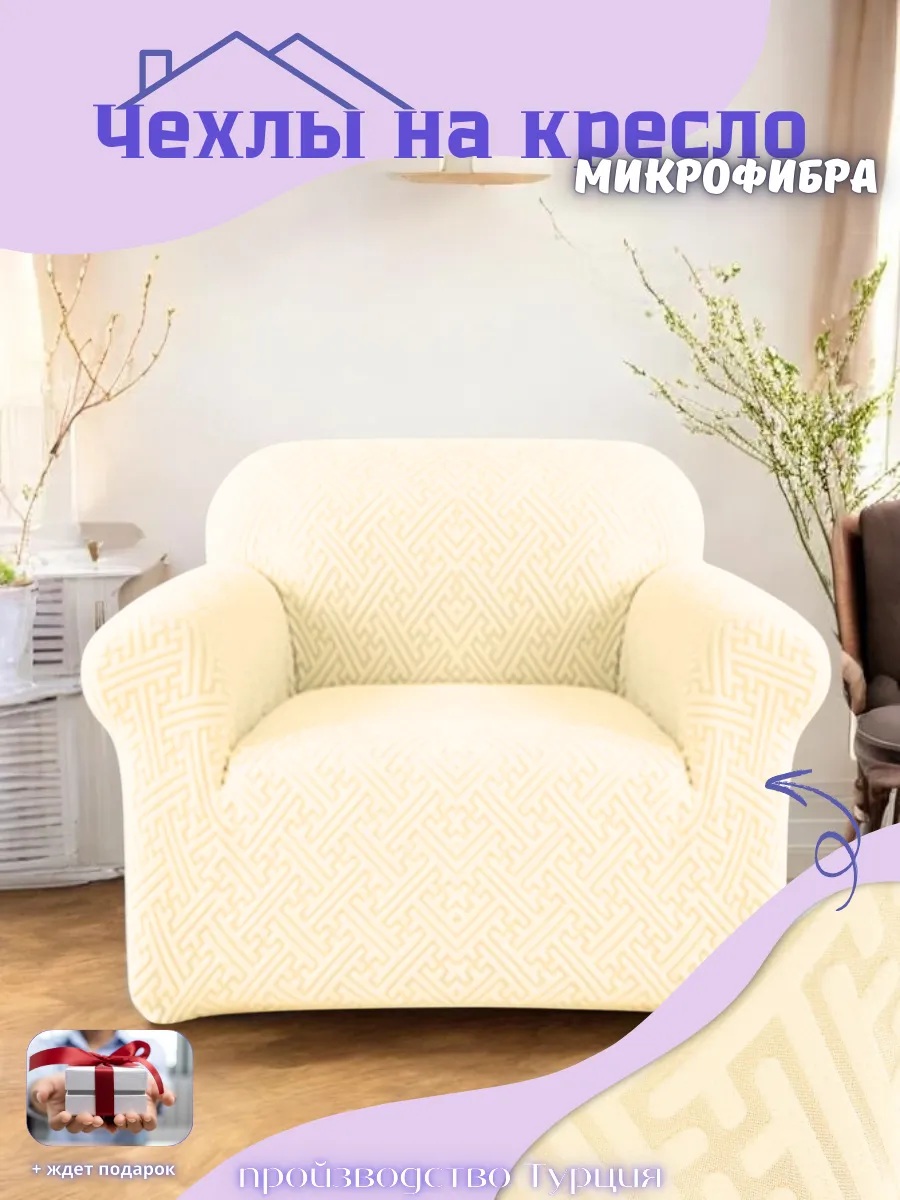 Чехол на кресло без оборки, жаккард, кремовый, натуральный кремовый