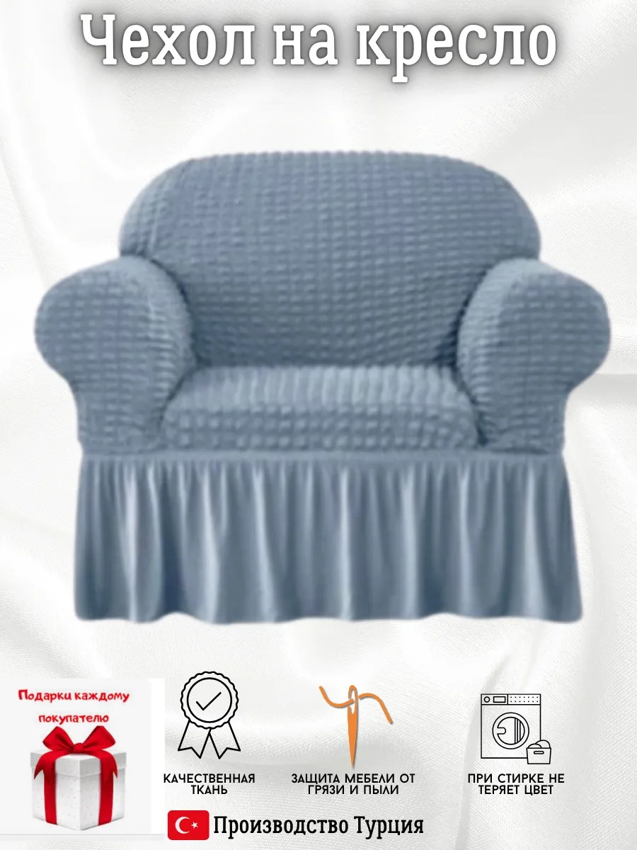 Чехол на кресло с оборкой, стрейч, небесно-голубой