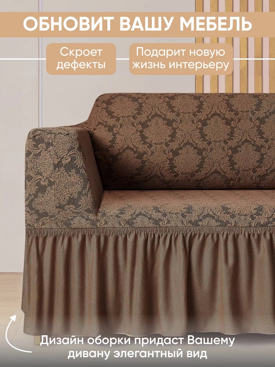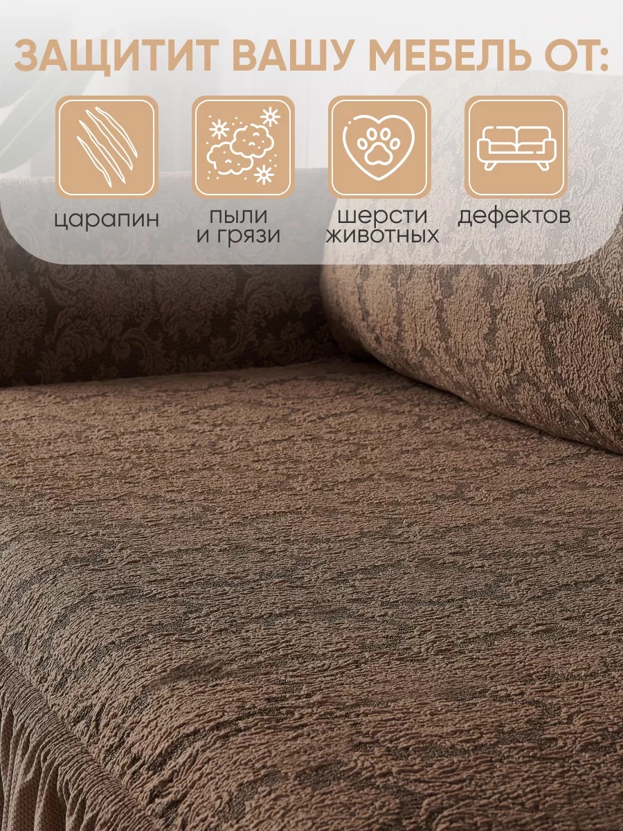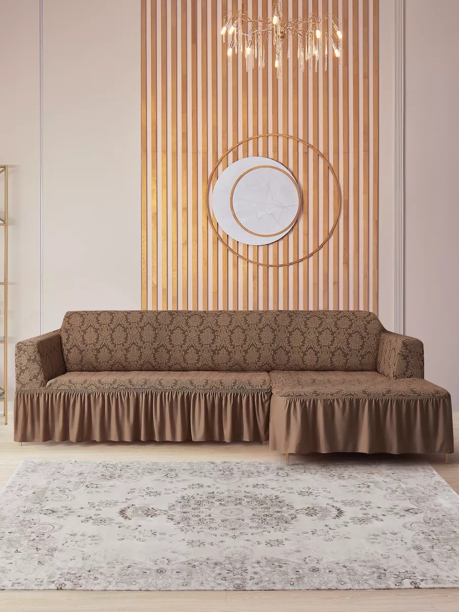 Чехол на угловой диван с оборкой Жаккард ,коричневый