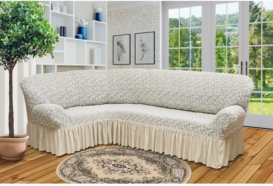 Чехол на угловой диван с оборкой Жаккард ,ванильный