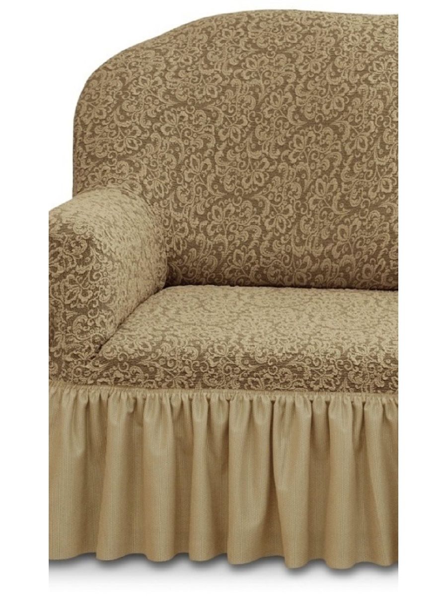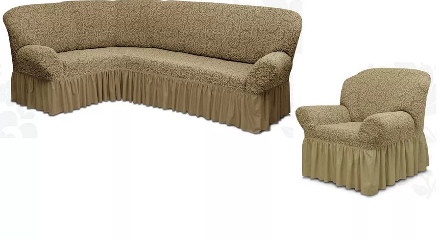 Чехол на угловой диван и кресло с оборкой Жаккард,Кофе с молоком