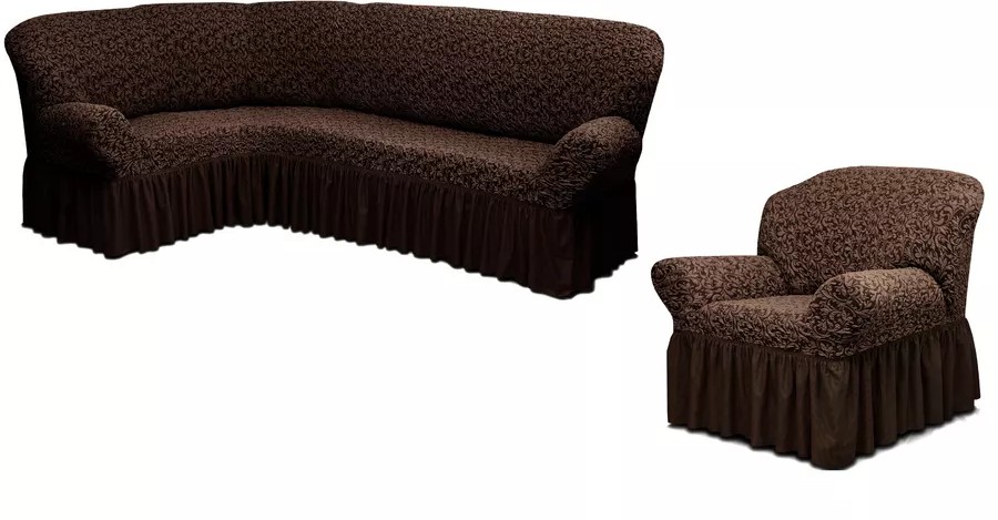 Чехол на угловой диван и кресло с оборкой Жаккард,шоколадный