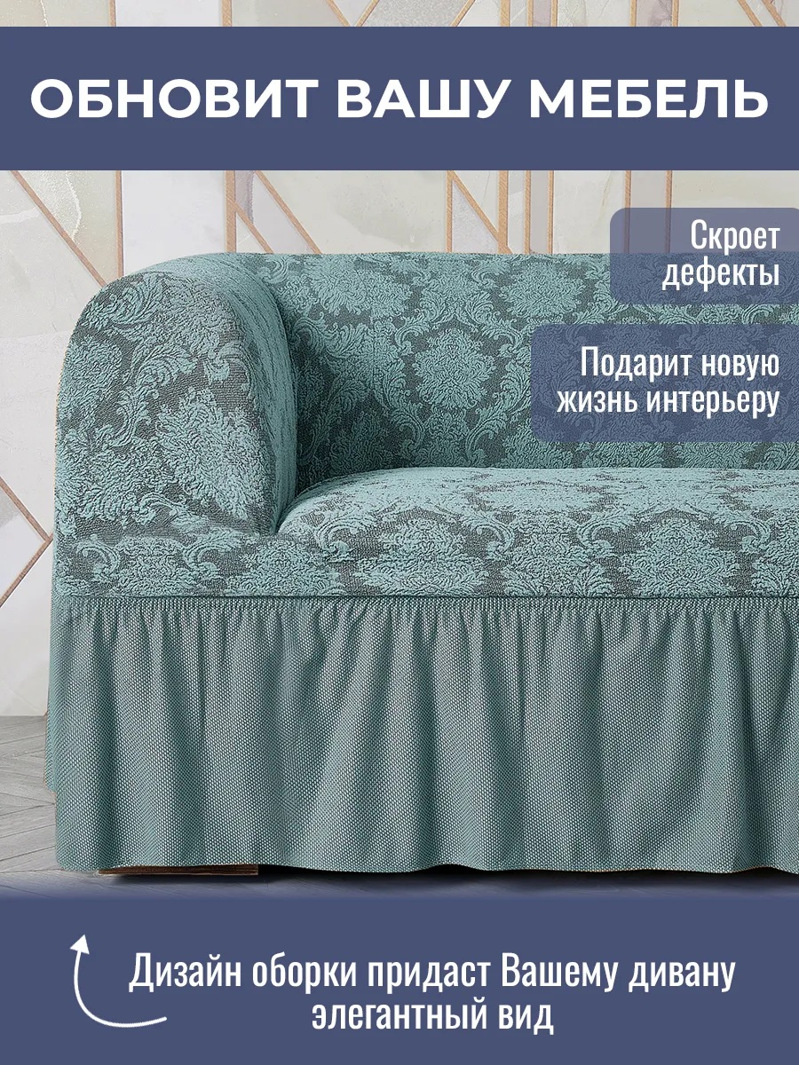 Чехол на угловой диван с оборкой Жаккард ,мятный