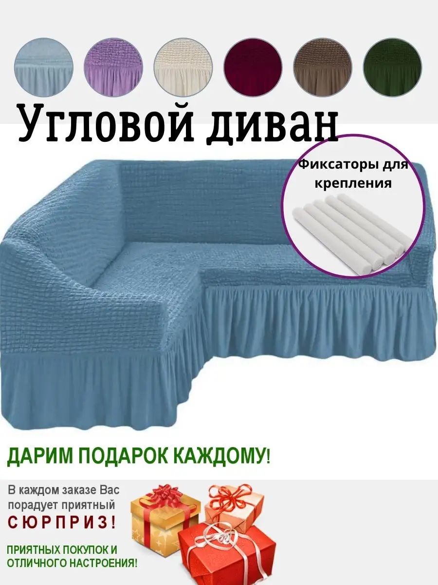 Чехол на угловой диван с оборкой, стрейч, голубые джинсы