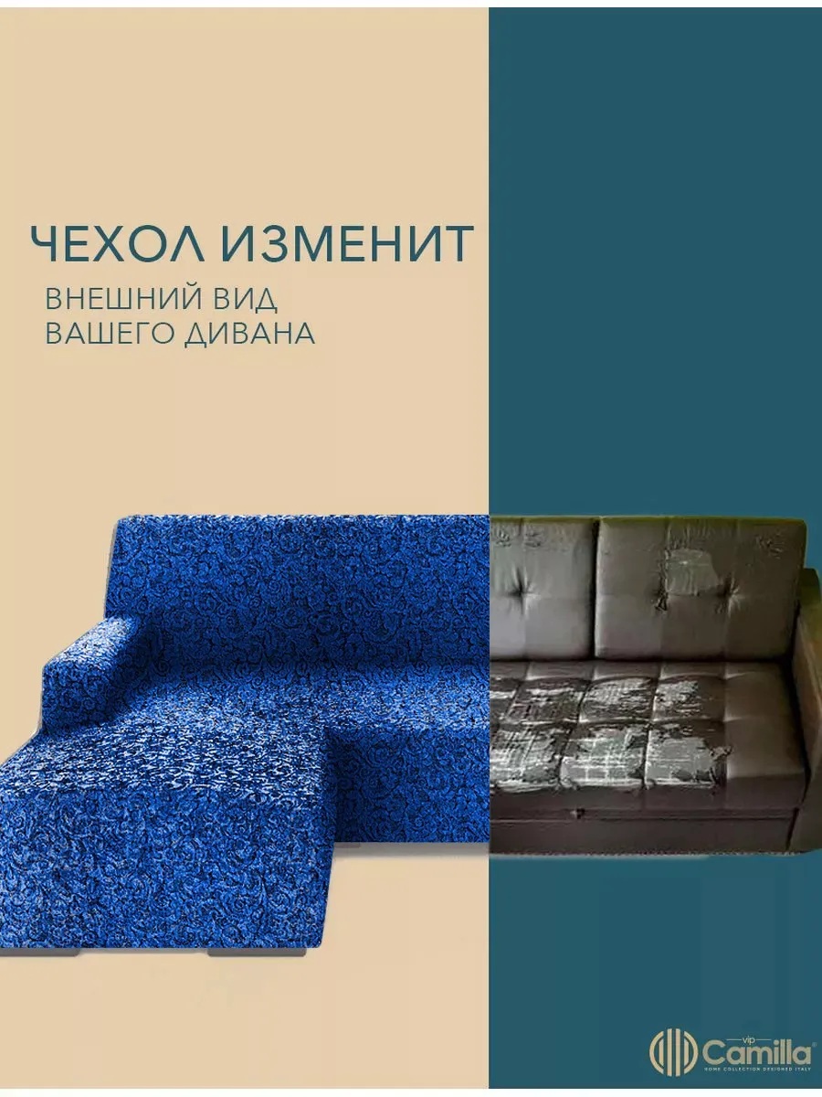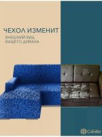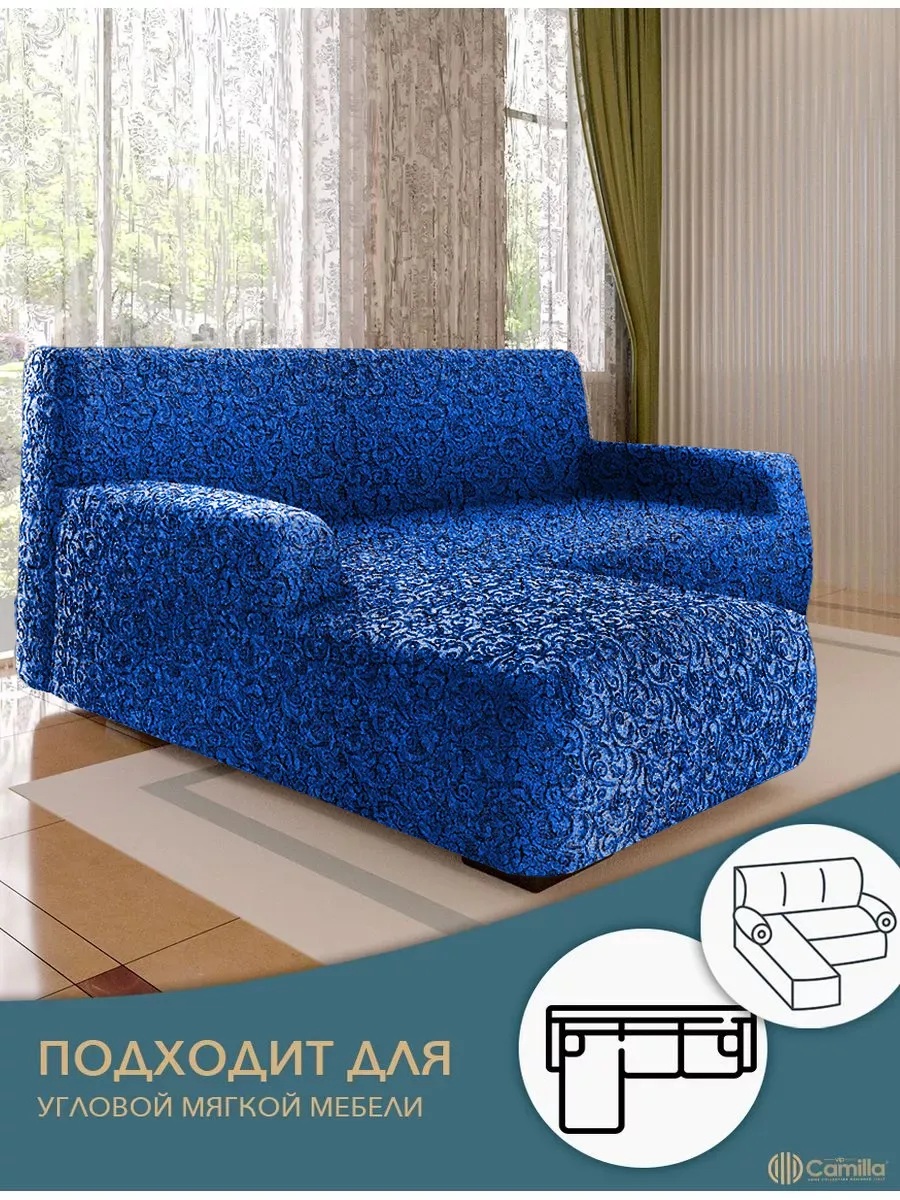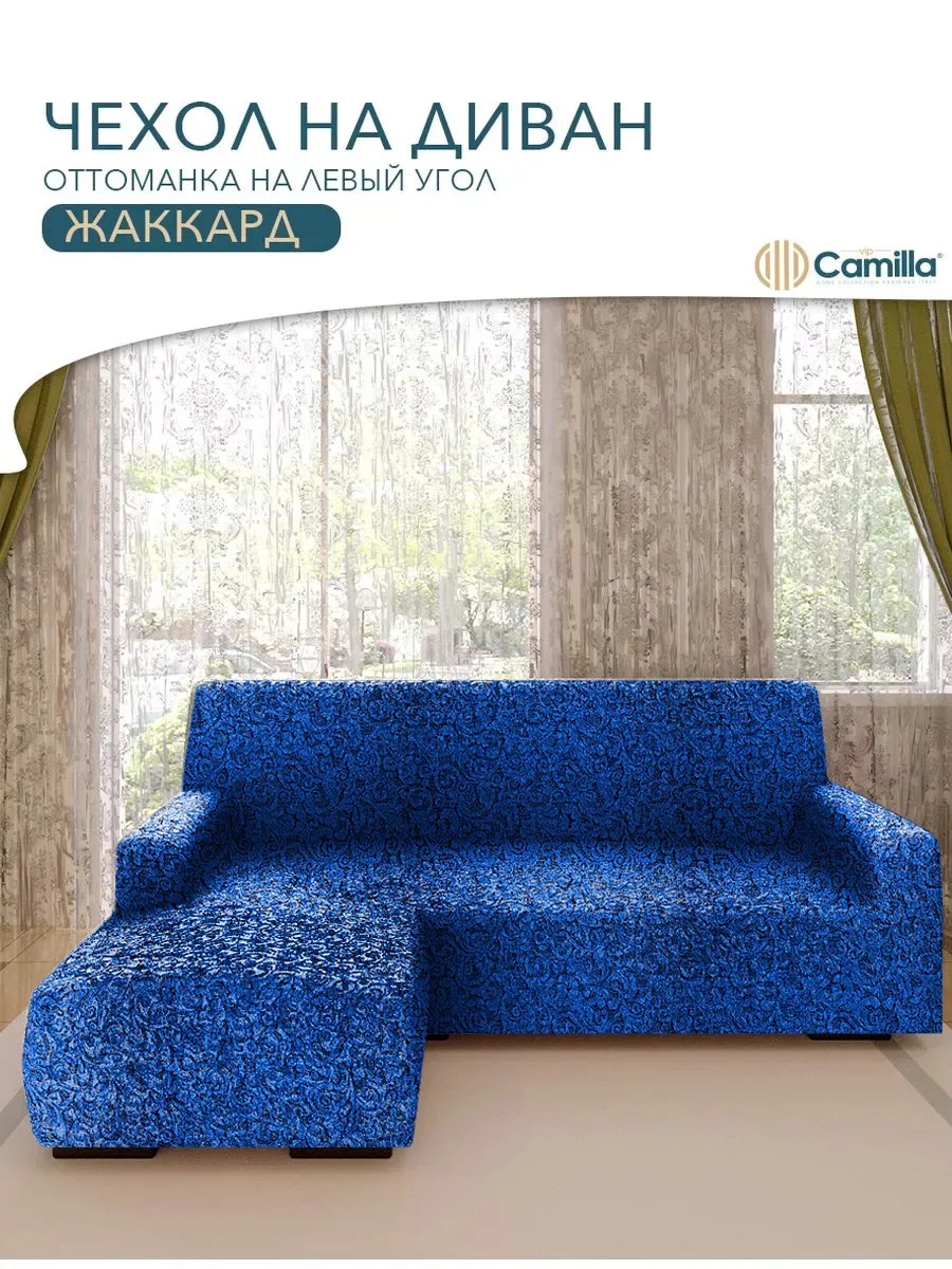 Чехол на угловой диван с оттоманкой (левая сторона), жаккард, синий