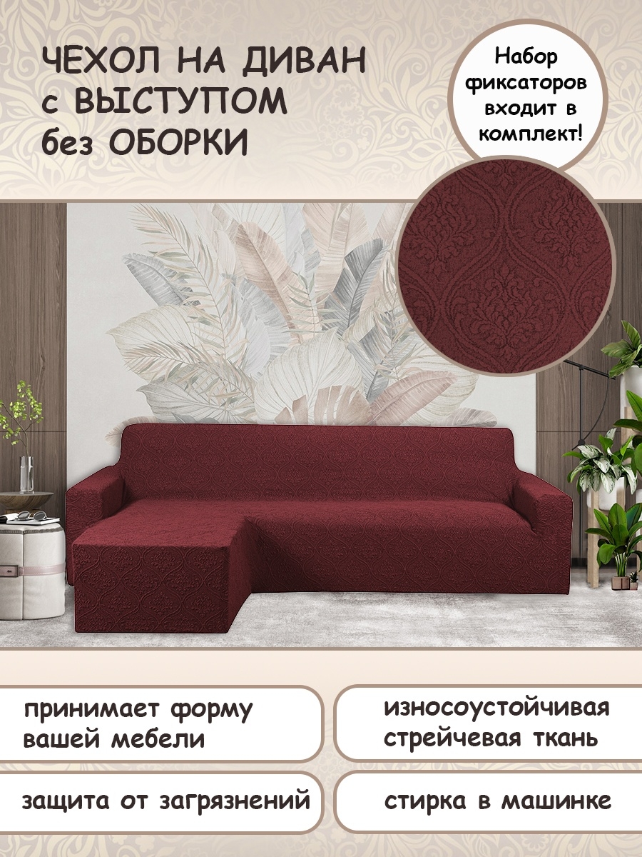 Чехол на угловой диван с оттоманкой левый угол Жаккард ,бордовый