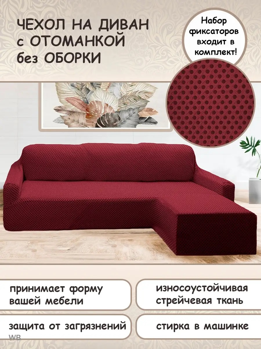 Чехол на угловой диван с оттоманкой правый угол,бордовый