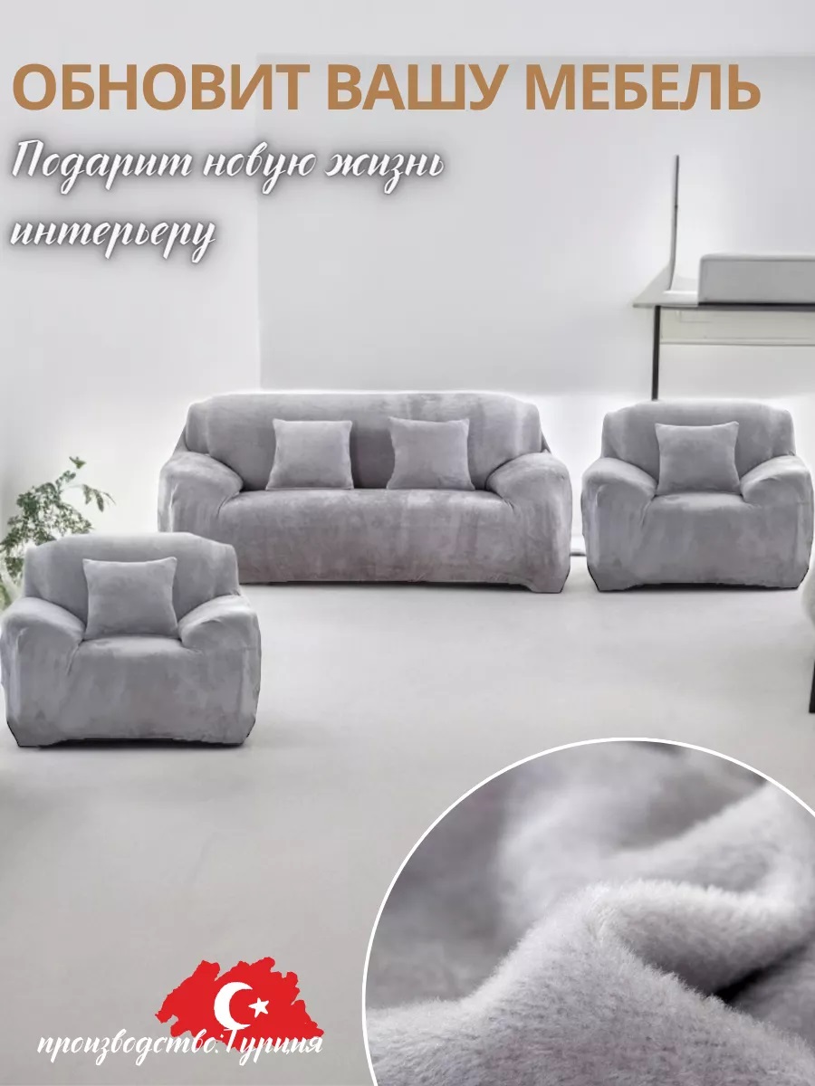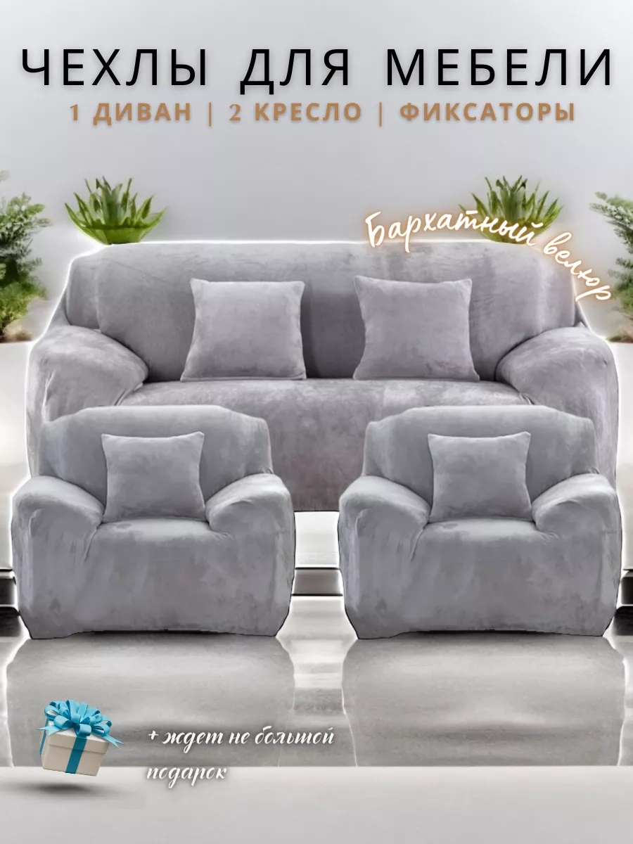 Комплект чехлов на диван и 2 кресла без оборки Бархатный велюр(мех) ,серый