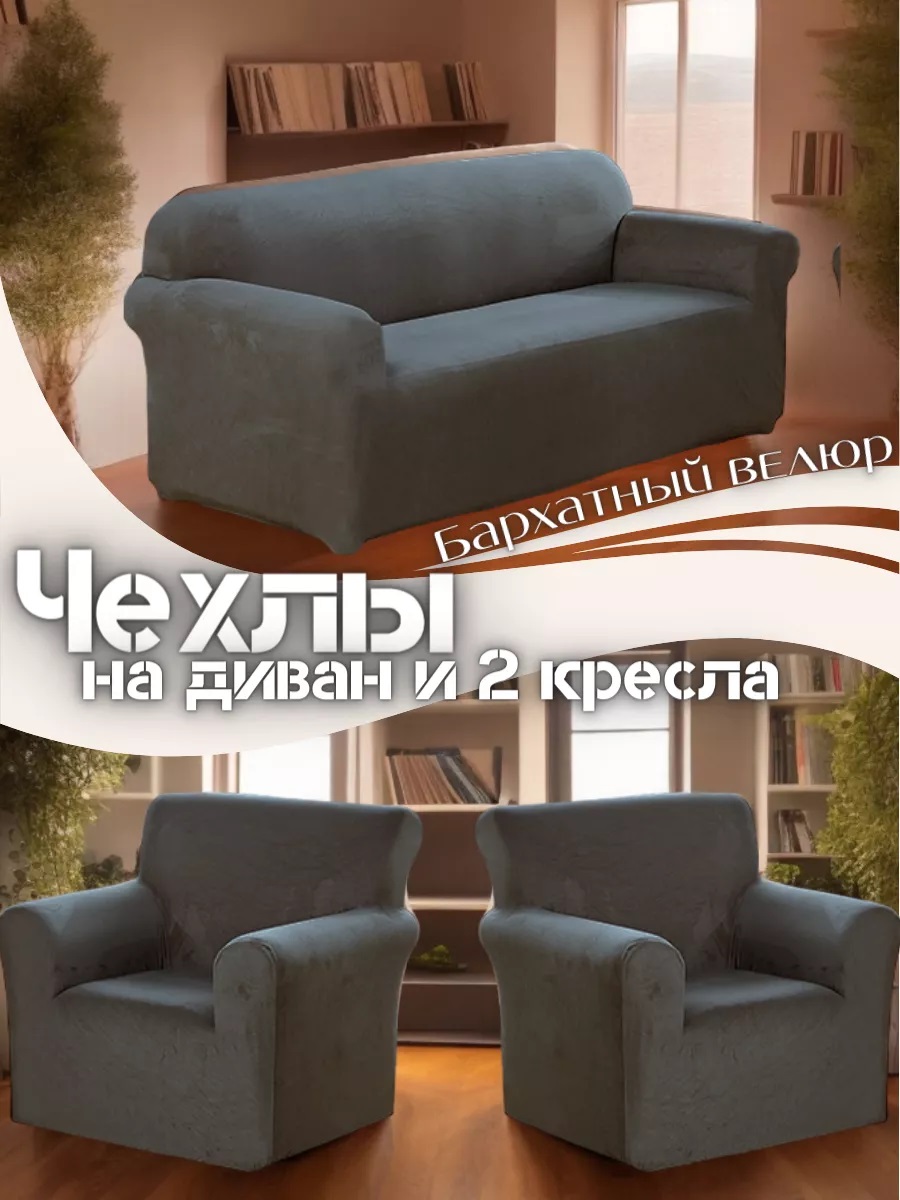 Комплект чехлов на диван и 2 кресла без оборки Бархатный велюр(мех) ,средне-серый