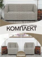 Комплект чехлов на диван и 2 кресла, без оборки, жаккард, светло-серый