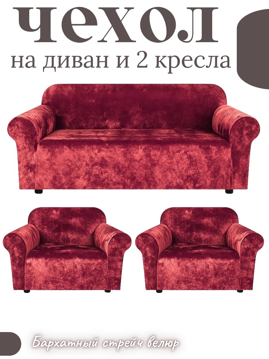 Комплект чехлов на диван и 2 кресла без оборки Бархатный Велюр , красный