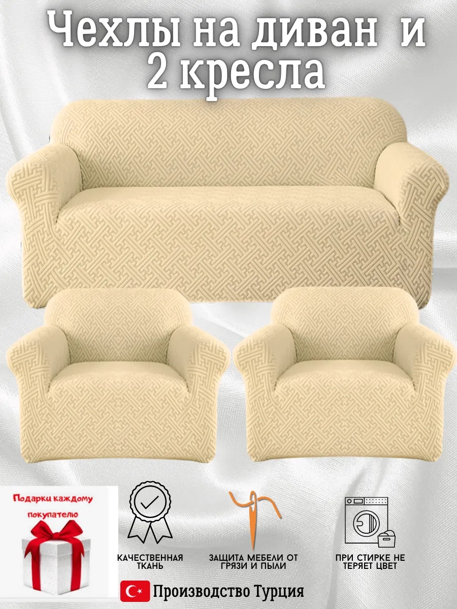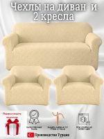 Комплект чехлов на диван и 2 кресла без оборки Бархатный Жаккард ,молочный