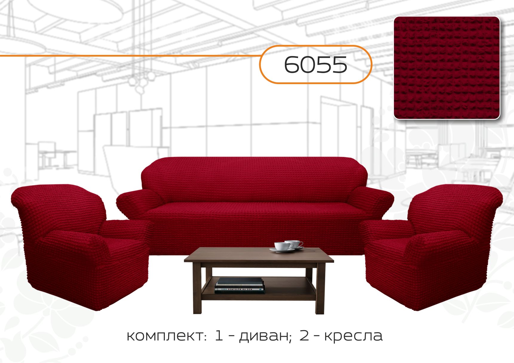 Комплект чехлов на 3-х местный диван и 2 кресла без оборки ,Бордовый