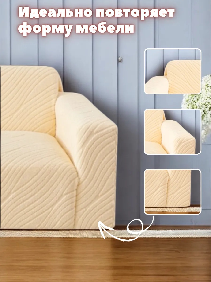Комплект чехлов на диван и 2 кресла без оборки Бархатный Жаккард ,кремовый