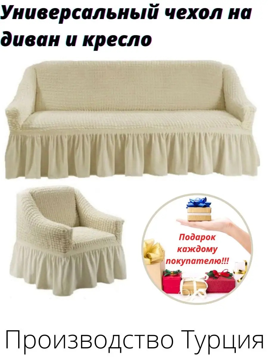 Чехол на 3-х местный диван и 1 кресло с оборкой ,бежевый