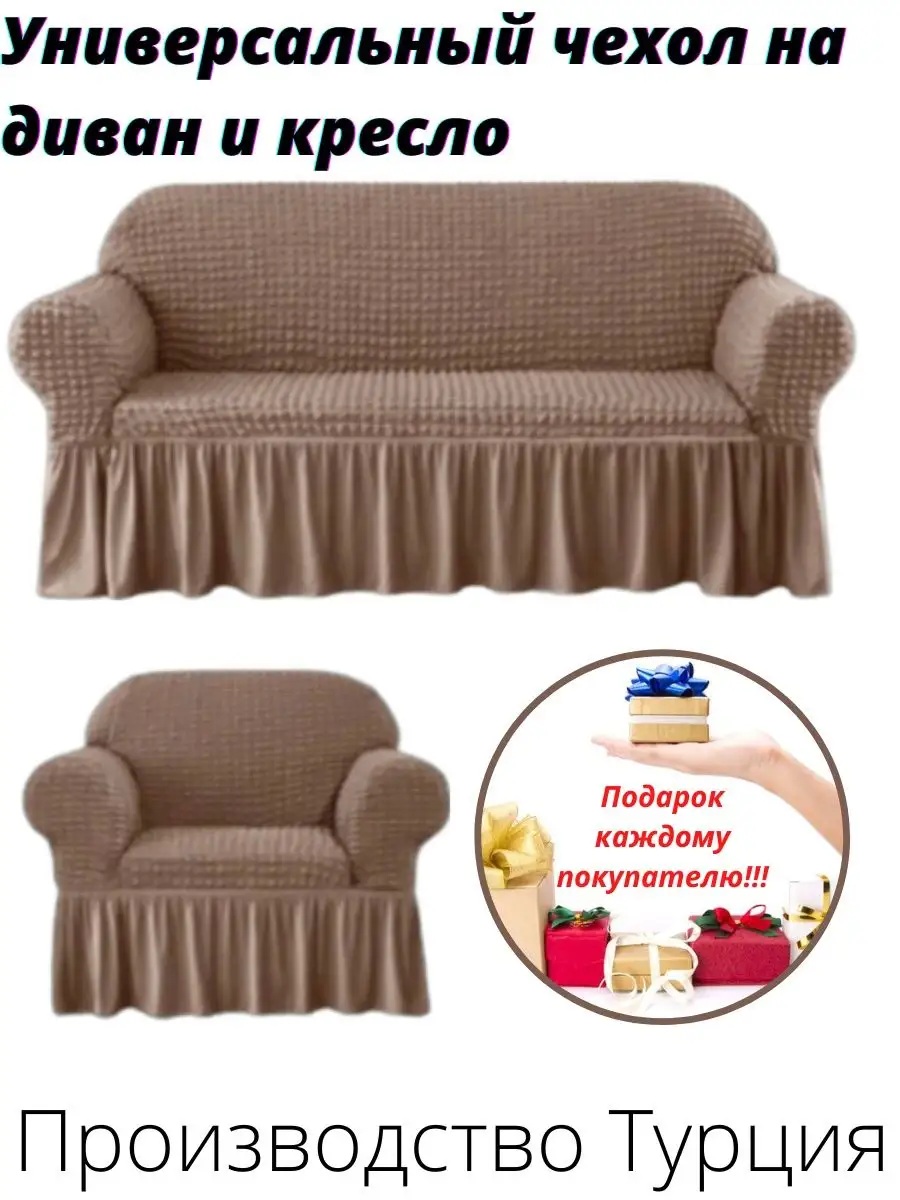 Чехол на 3-х местный диван и 1 кресло с оборкой ,серо-коричневый