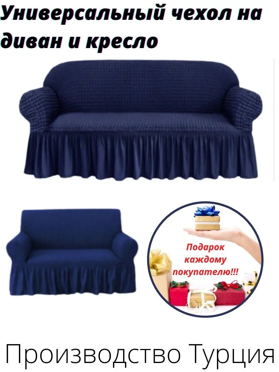 Чехол на 3-х местный диван и 1 кресло с оборкой ,темно-синий