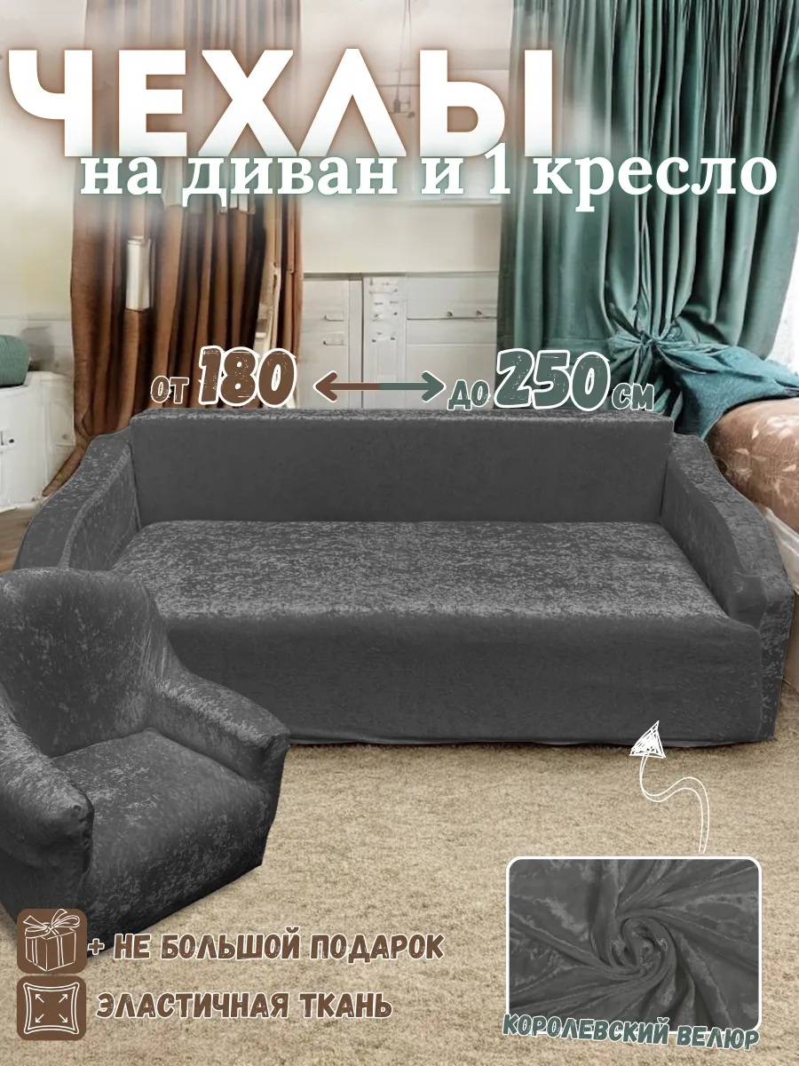 Чехол на 3-х местный диван и 1 кресло без оборки Королевский велюр ,темно-серый
