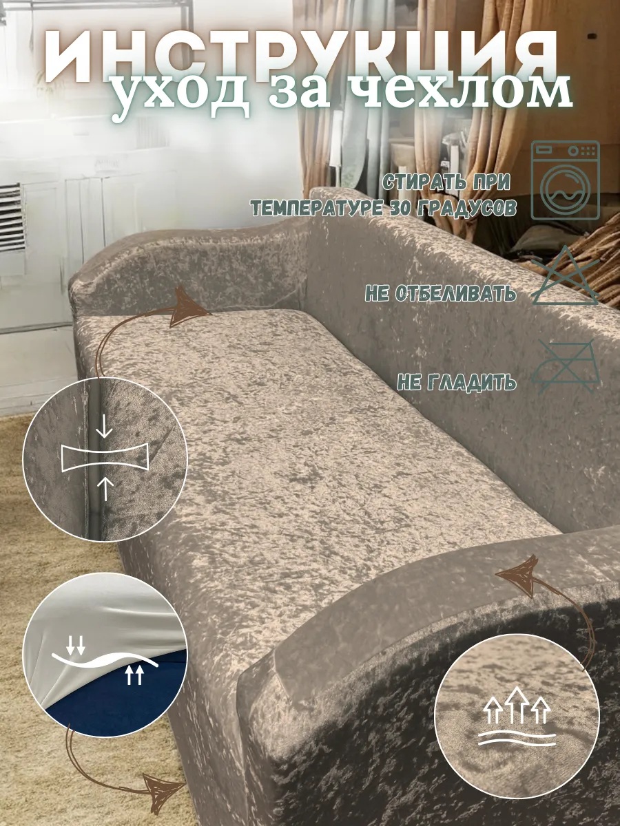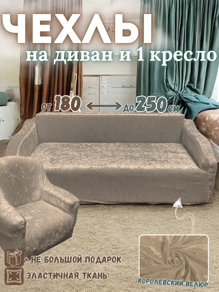 Чехол на 3-х местный диван и 1 кресло без оборки Королевский велюр ,пепельно-коричневый