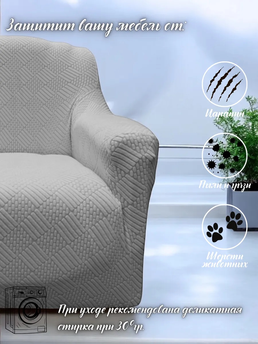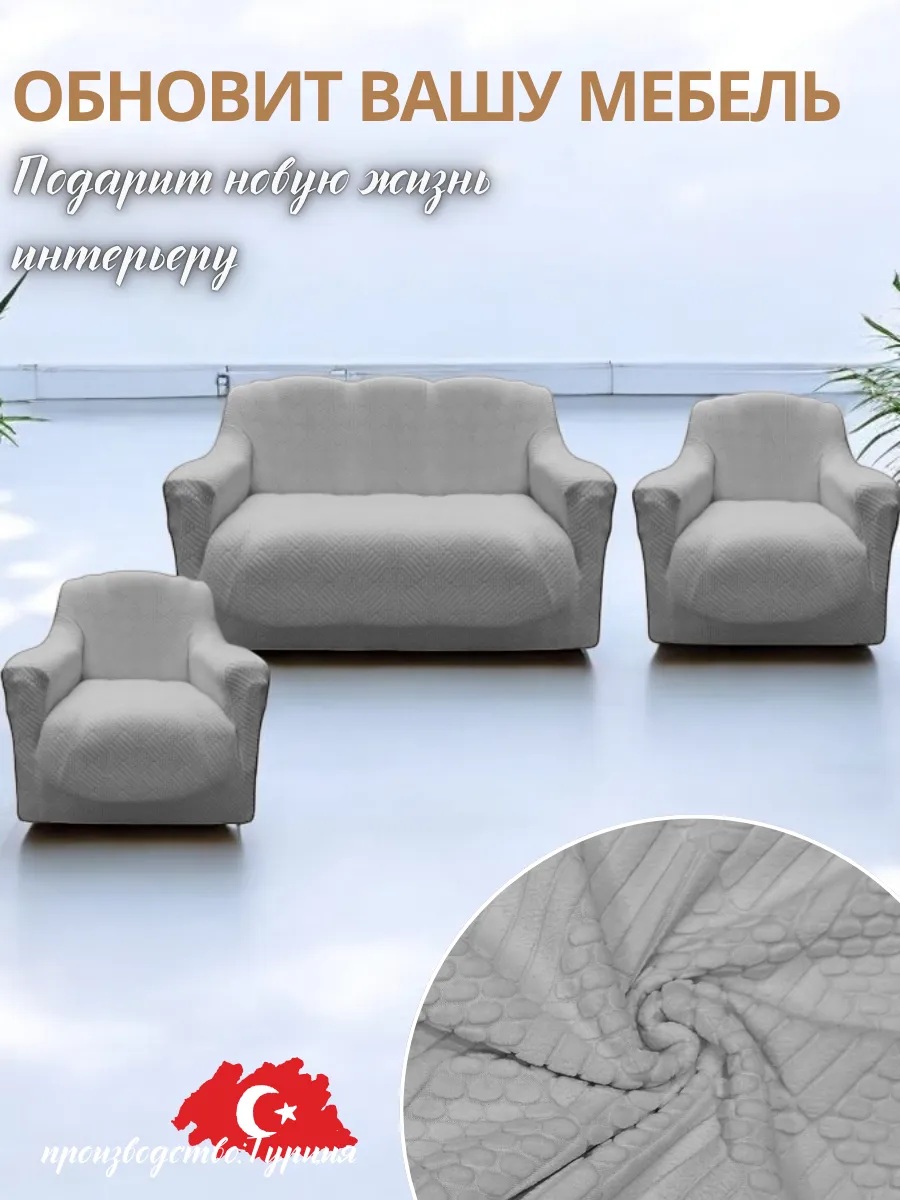 Комплект чехлов на диван и 2 кресла без оборки Бархатный Жаккард ,серый гранит