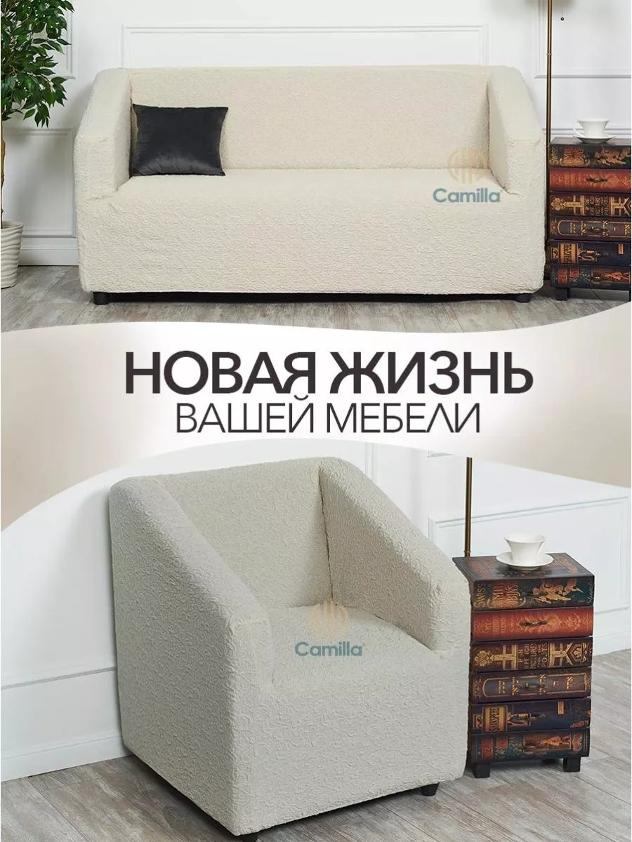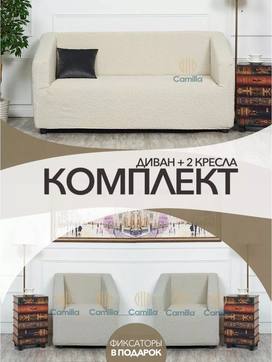 Комплект чехлов на диван и 2 кресла без оборки Жаккард , молочный
