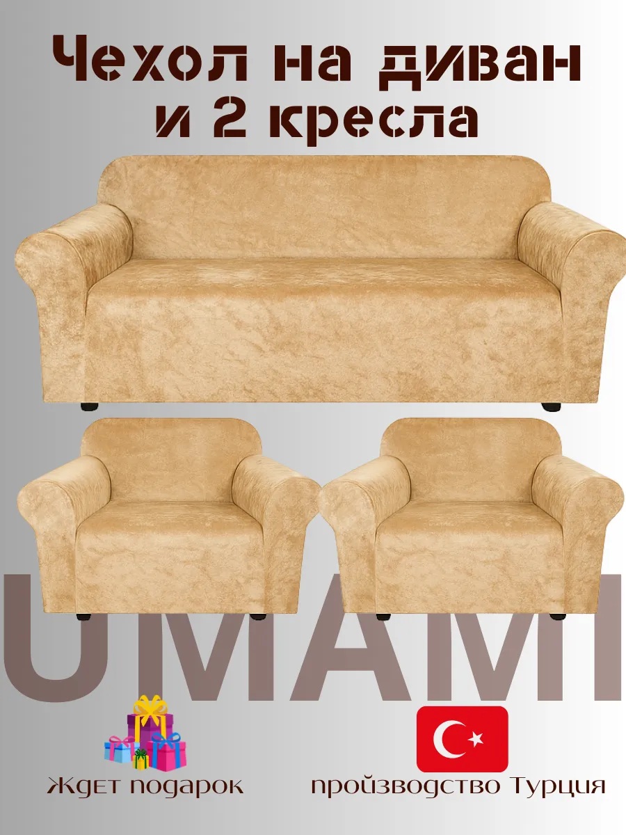 Комплект чехлов на диван и 2 кресла без оборки Бархатный Велюр ,медово-бежевый
