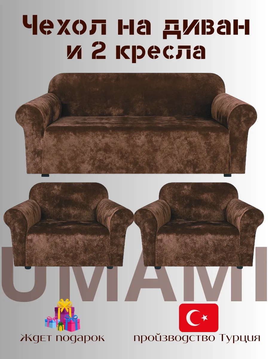 Комплект чехлов на диван и 2 кресла без оборки Бархатный Велюр ,шоколадно-коричневый