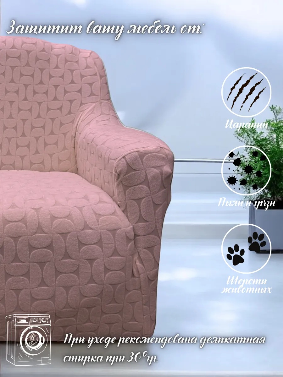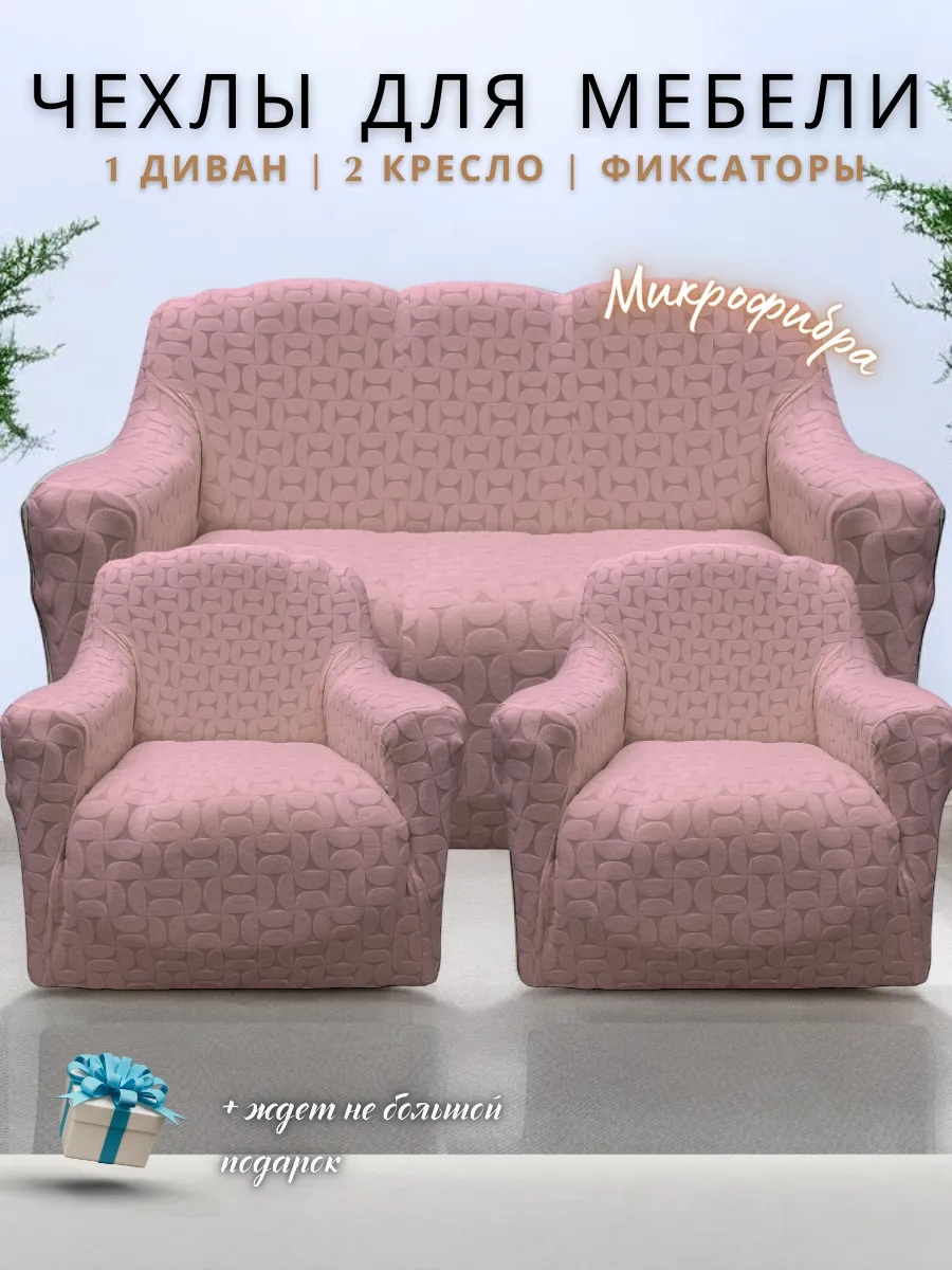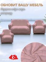 Комплект чехлов на диван и 2 кресла без оборки Бархатный Жаккард ,розовый дым