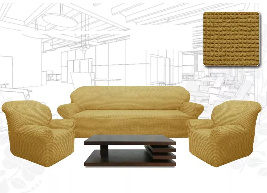 Комплект чехлов на 3-х местный диван и 2 кресла без оборки ,Бежевый