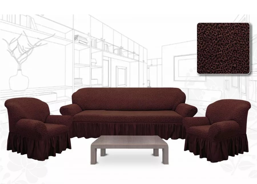 Комплект чехлов на 3-х местный диван и 2 кресла с оборкой Клетка ,шоколадный