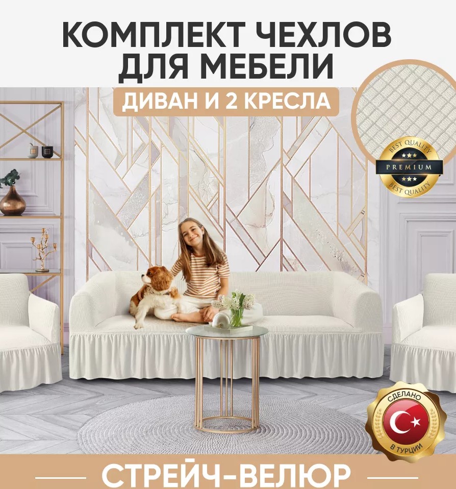 Комплект чехлов на 3-х местный диван и 2 кресла с оборкой Велюр ,кремовый