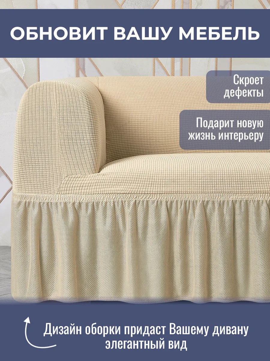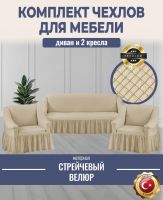 Комплект чехлов на 3-х местный диван и 2 кресла с оборкой Велюр ,молочный