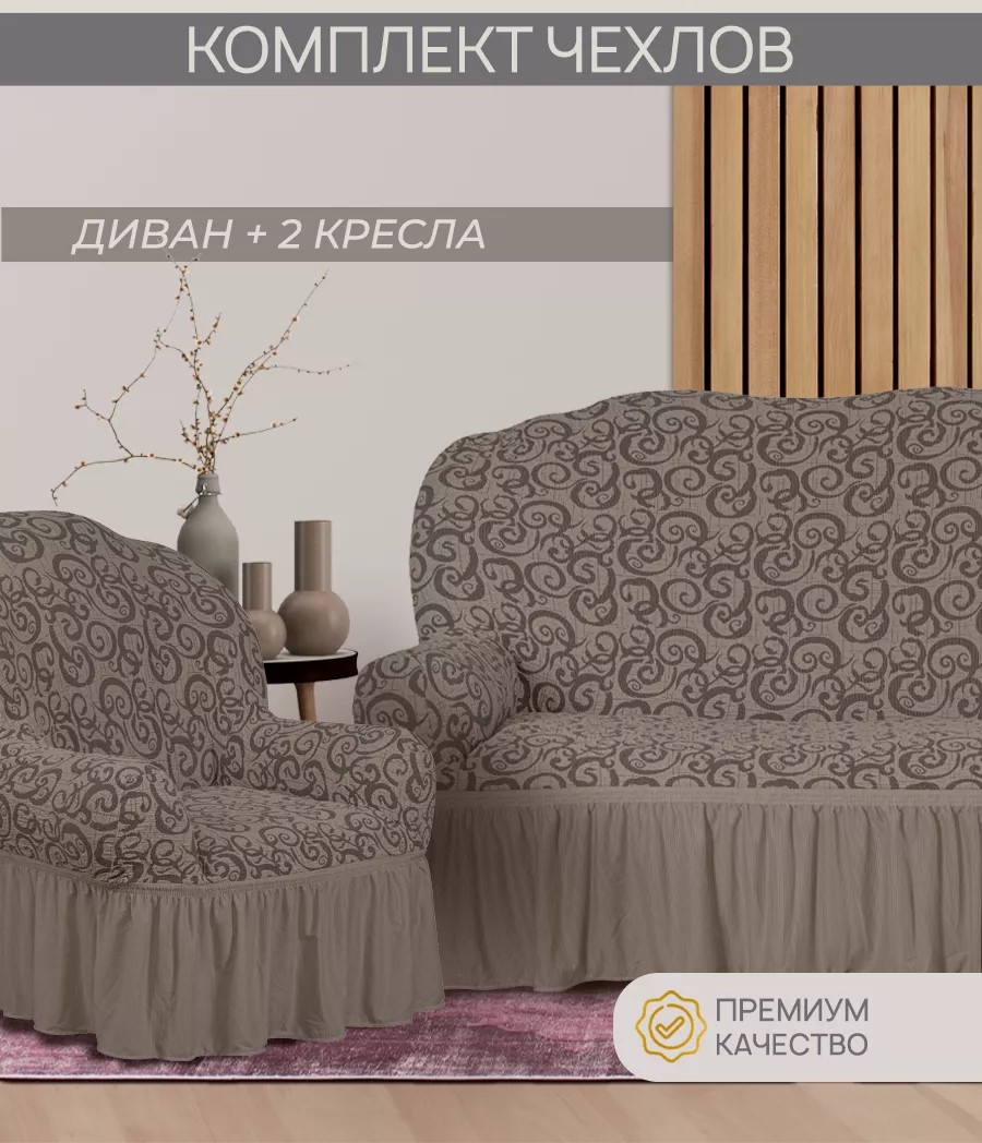 Комплект чехлов на 3-х местный диван и 2 кресла с оборкой Жаккард ,серо-бежевый