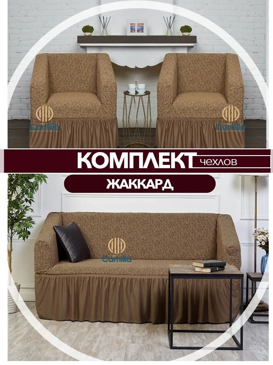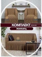 Комплект чехлов на 3-х местный диван и 2 кресла с оборкой Жаккард ,кофе с молоком