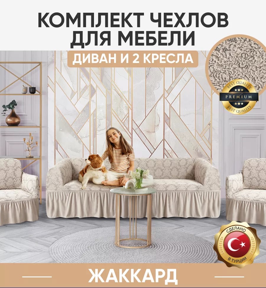 Комплект чехлов на 3-х местный диван и 2 кресла с оборкой Жаккард ,кремовый