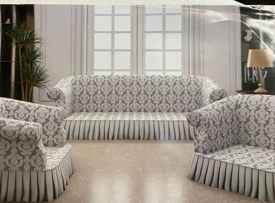 Комплект чехлов на 3-х местный диван и 2 кресла с оборкой Жаккард ,светло-серый меланж