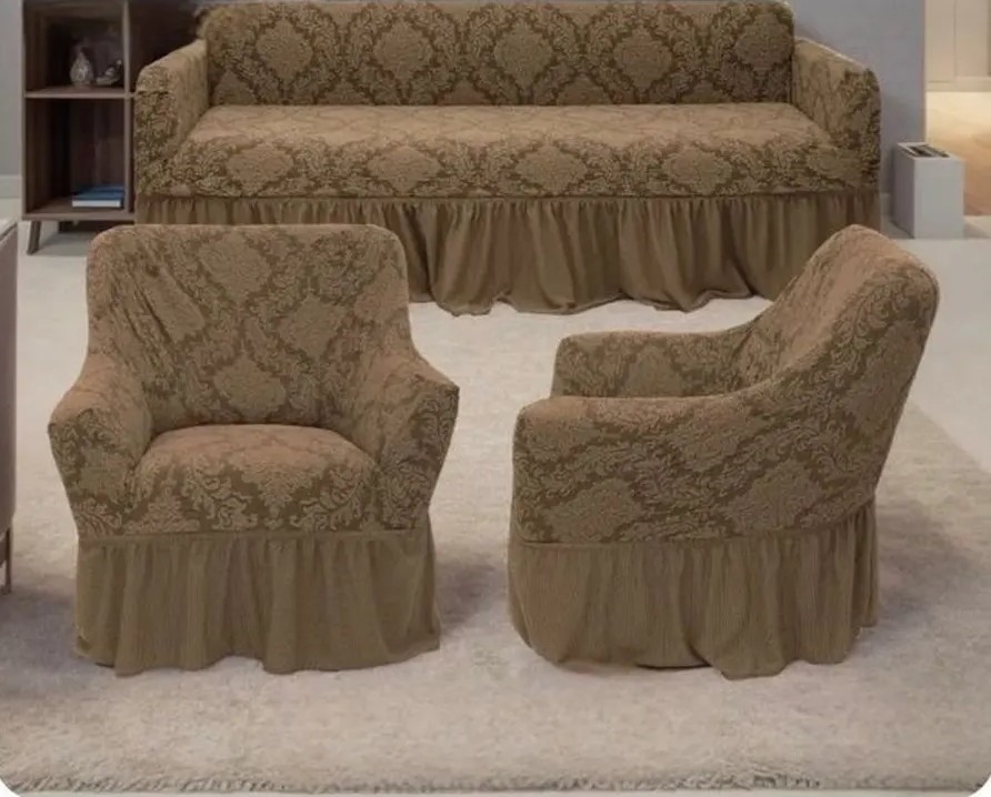 Комплект чехлов на 3-х местный диван и 2 кресла с оборкой Жаккард ,коричневый
