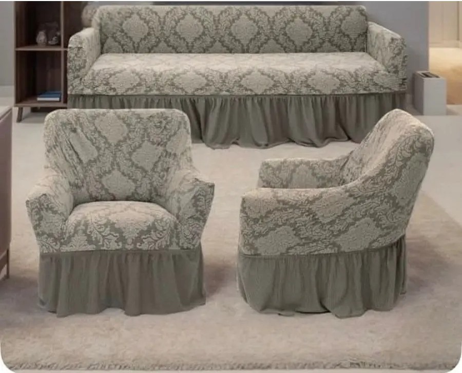Комплект чехлов на 3-х местный диван и 2 кресла с оборкой Жаккард ,светло-серый